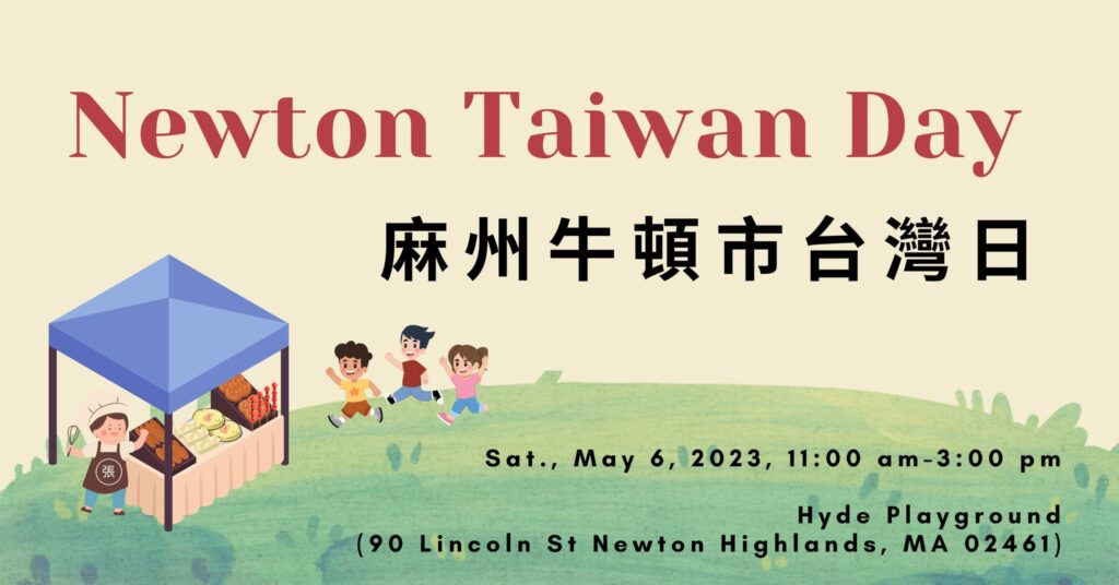 Newton Taiwan Day will be held on Saturday May 6, 11AM-3PM at the Hyde Playground (90 Lincoln Street, Newton Highlands). It starts with a dragon dance from playground down Lincoln Street to Walnut Street. There will be performances and exhibit booths showcasing Taiwanese cuisine, arts & crafts.