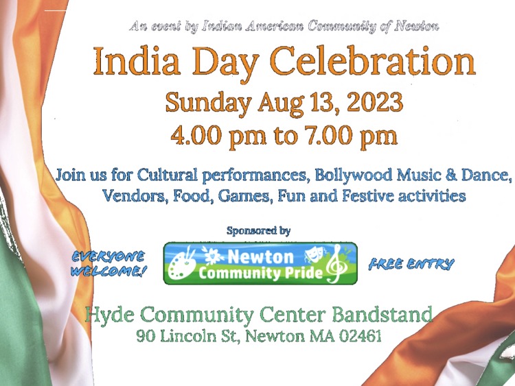 Newton’s India Day will be celebrated with Bollywood dance and music, cultural performances, food, and other activities organized by the Indian American Community of Newton. It will take place at Hyde Community Center Bandstand (90 Lincoln Street, Newton Highlands) on August 13, 4PM-7PM. For more information, email [email protected] or call…