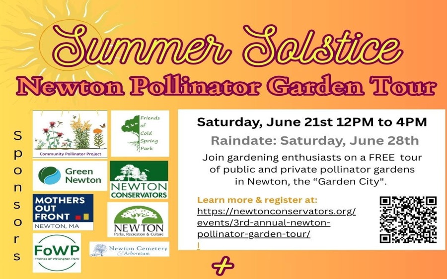 Newton’s 3rd Annual Pollinator Garden Tour will be held on June 21 (rain date, June 28), 12PM-4PM. Celebrate the solstice with a visit public and private native plant gardens all across Newton to have fun, enjoy beautiful gardens, celebrate the arrival of summer, and get ideas for your own yard.…