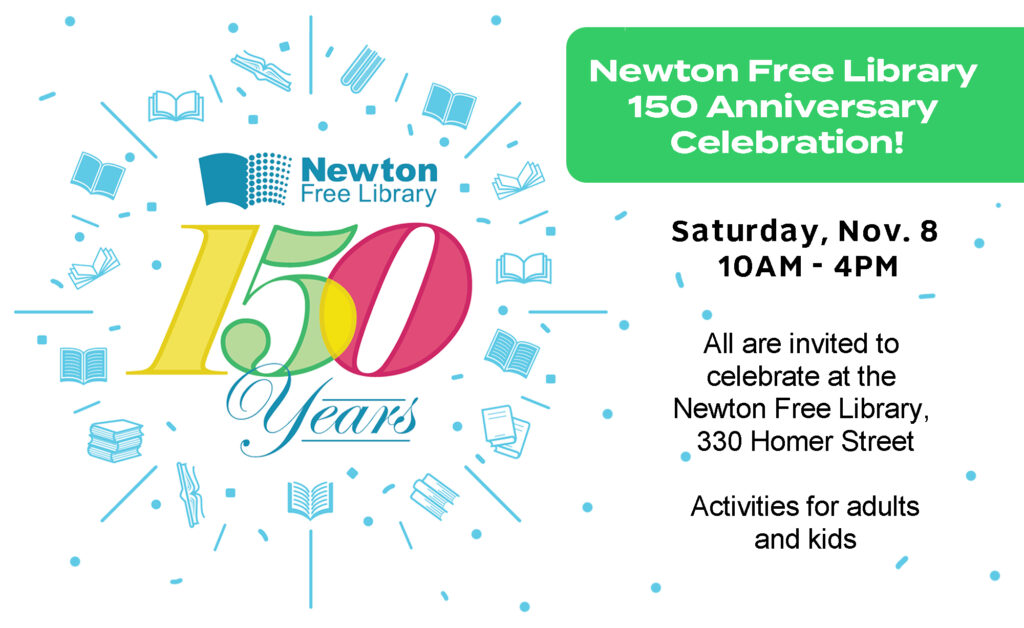 Join the Newton Free Library (330 Homer Street, Newton) on Saturday, November 8, from 10AM-4PM to celebrate the150th anniversary of the vote to transfer the library to the City of Newton. Throughout the day, there will be activities for adults and kids of all ages. Celebration Schedule All Day: Stop…