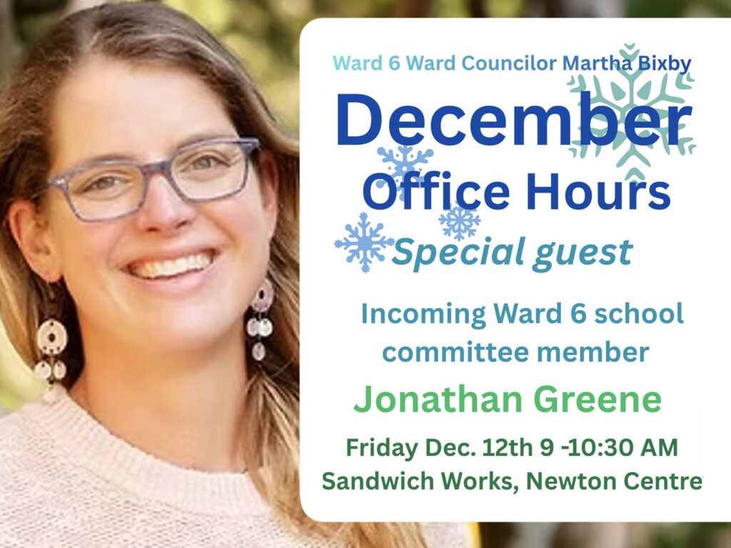 Ward 6 Councilor Martha Bixby will hold office hours at Sandwich Works in Newton Centre on Friday, December 12 from 9-10:30AM. Joining her will be incoming Ward 6 school committee member Jonathan Greene.