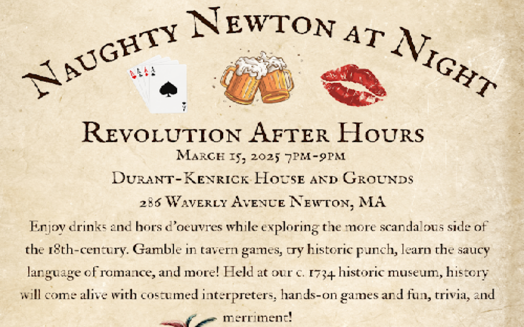 Historic Newton will host Naughty Newton at Night: Revolution After Hours, a 21+ cocktail party where participants can explore the more scandalous topics of the American revolution such as favorite alcoholic beverages and commonly worn underwear types. The event will take place on Saturday, March 15, 7-9PM at the Durant-Kenrick…