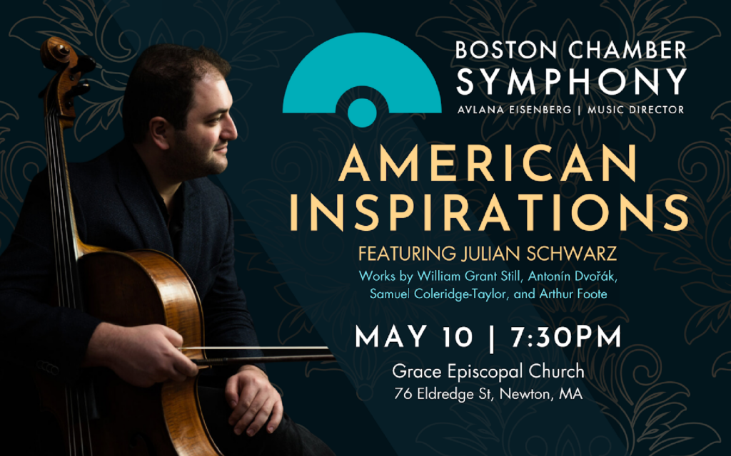 The Boston Chamber Symphony will host a concert featuring the World Premiere of William Grant Still’s “American Suite,” alongside additional works including the Boston-area Premiere of Arthur Foote’s “Cello Concerto” performed by acclaimed soloist Julian Schwarz. It will take place on Saturday, May 10, 7:30PM at the Grace Episcopal Church (76 Eldredge Street, Newton…