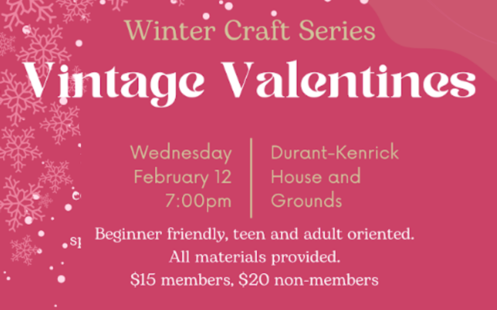 Historic Newton will host Winter Craft Series: Vintage Valentines where participants can craft personalized valentines using materials inspired by vintage Valentine’s cards. It will take place on Wednesday, February 12, 7-9PM at the Durant-Kenrick House and Grounds (286 Waverley Avenue, Newton Corner). Registration is $15 for members, $10 for non-members.