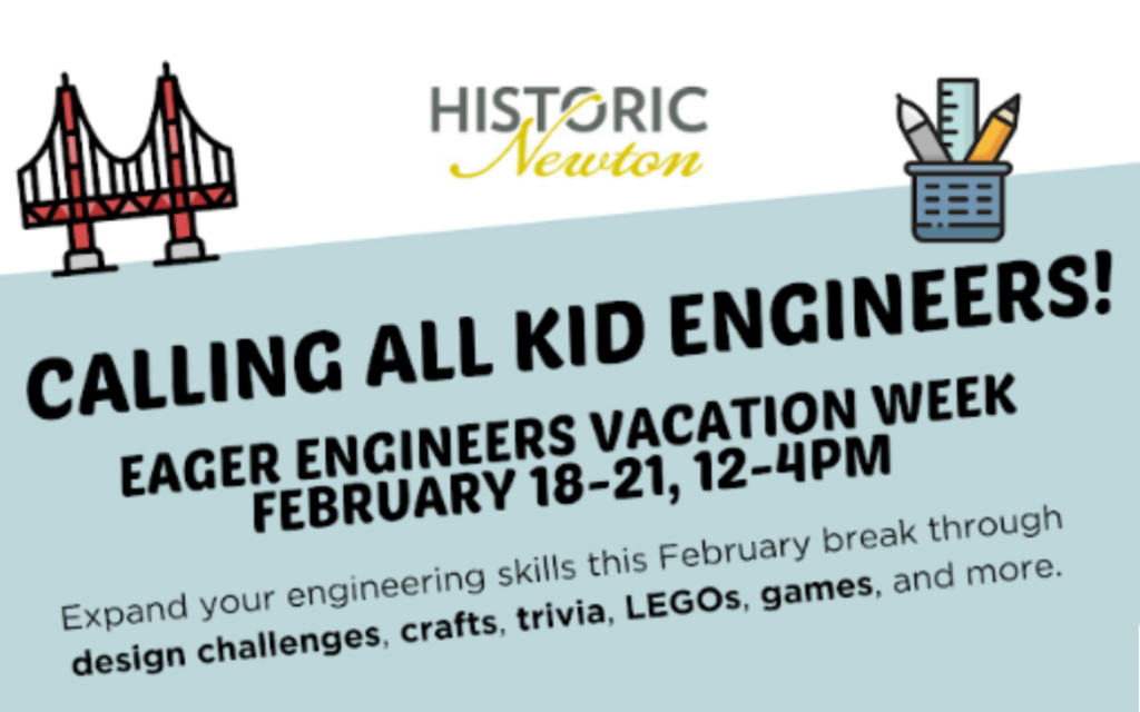 Historic Newton will be hosting Eager Engineers, a 4-day program during the February School Vacation Week. Participants can expand their engineering skills by using the design process to build a supertall tower, a bridge that can hold weight, a marble run roller coaster, a brand-new invention, and more. Registration is…