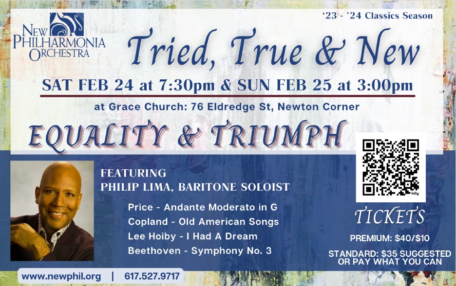 The New Philharmonic Orchestra will perform with baritone soloist Phil Lima in the New Phil’s second concert in its Classics series this year: Equality & Triumph! It takes place on Saturday, February 24 at 7:30 PM and Sunday, February 25 at 3PM at Grace Episcopal Church (76 Eldredge Street, Newton…