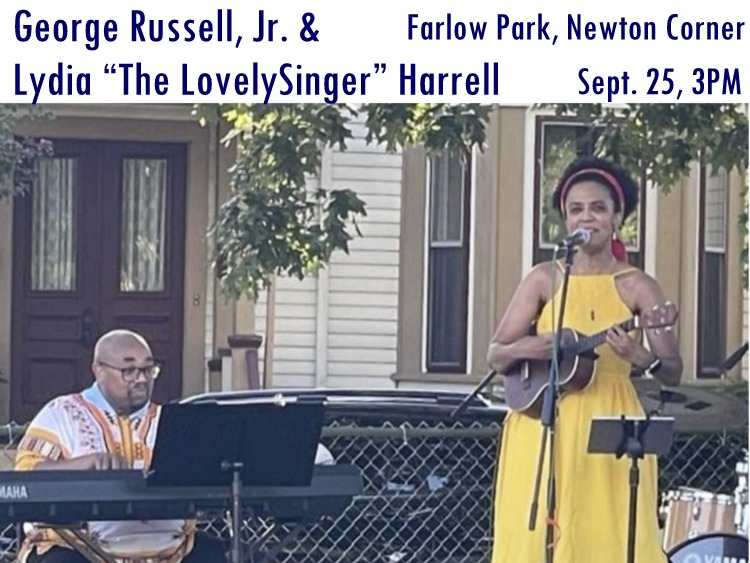 Newton Community Pride’s Fall Concert Series will feature a free concert by George Russell, Jr. and Lydia “The LovelySinger” Harrell at Farlow Park in Newton Corner on September 25 at 3PM.