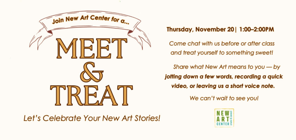 Join New Art Center for a Meet & Treat on Thursday, November 20, 1-2PM. Share what the New Art Center means to you — by jotting down a few words, recording a quick video, or leaving us a short voice note.