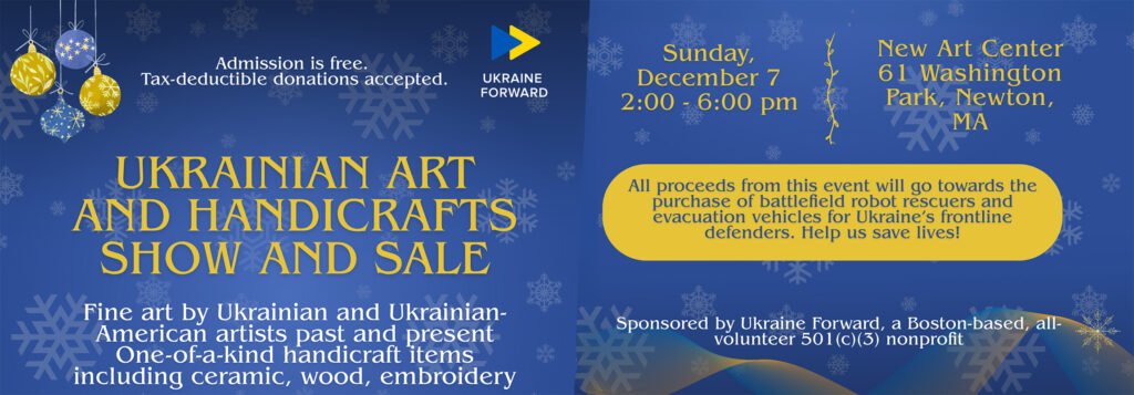 On Sunday, December 7, from 2-6 PM, Boston-based nonprofit Ukraine Forward is holding an exhibition and sale of Ukrainian fine arts and handicrafts at the New Art Center (61 Washington Park, Newton). Artwork includes paintings and graphic art as well as ceramic, wood, and textile objects by artisans in Ukraine and the…