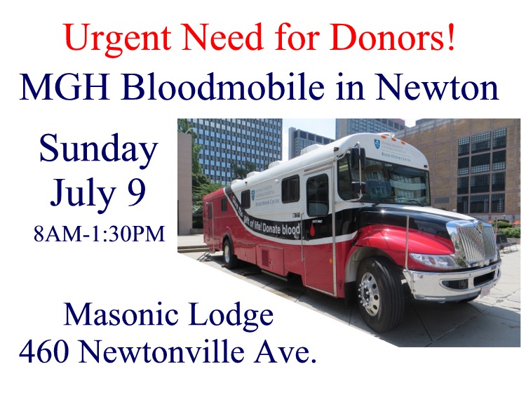 There is an urgent need for blood donations, and the Mass General Bloodmobile will be in Newton this Sunday, July 9 from 8AM to 1:30PM at the Masonic Lodge (460 Newtonville Avenue, Newtonville). Sign up here to donate whole blood. For more information, contact Bill Asadorian at 617-620-4128 or [email protected].