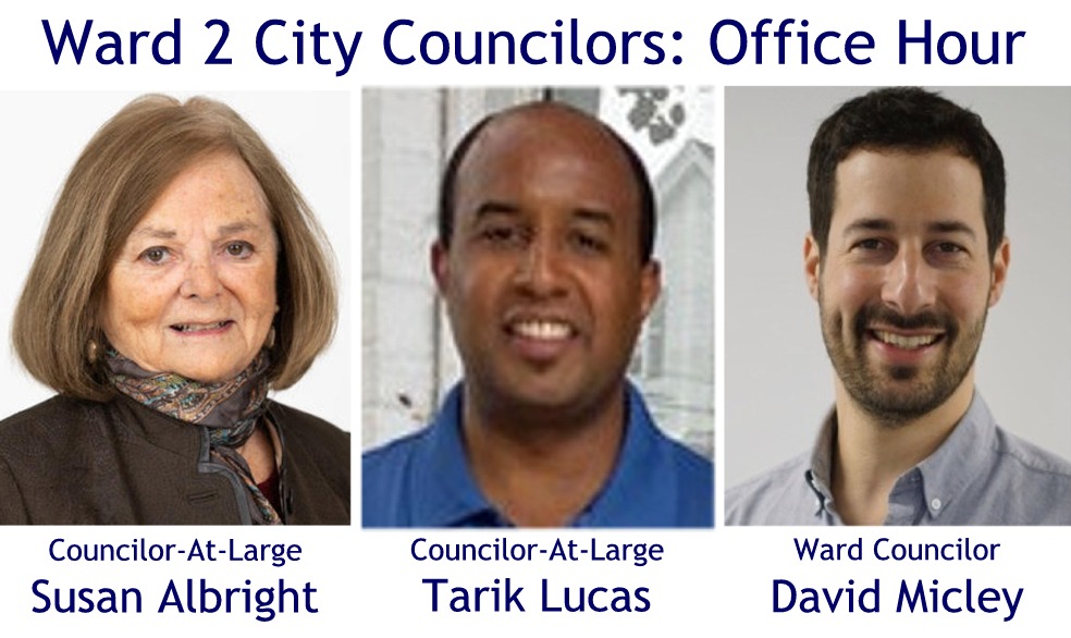 The City Councilors of Ward 2 — Councilors-At-Large Susan Albright and Tarik Lucas and Ward Councilor David Micley — will hold a joint office hour on September 19, 4PM-5PM, at Clover (835 Washington Street). Bring questions, feedback, or ideas.