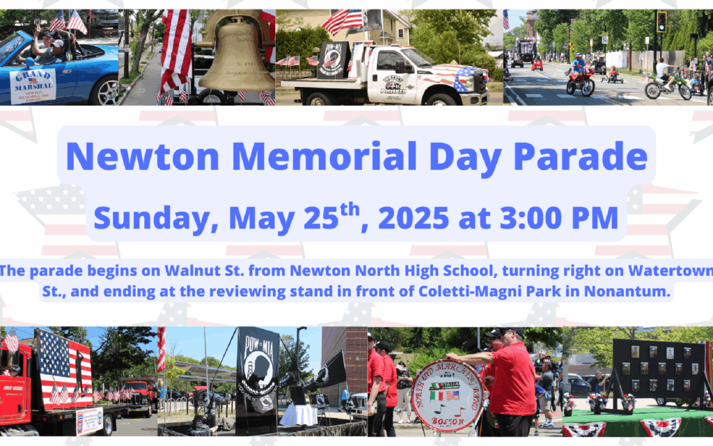 Wreath-Laying Ceremonies (Sunday, May 25)Wreaths will be laid down throughout the City’s bridges and monuments starting at 9AM at Forte Park (235 California Street, Nonantum). Memorial Day Parade (Sunday, May 25)It will begin at 3PM at Newton North High School (457 Walnut Street, Newtonville) and will continue down Walnut Street…