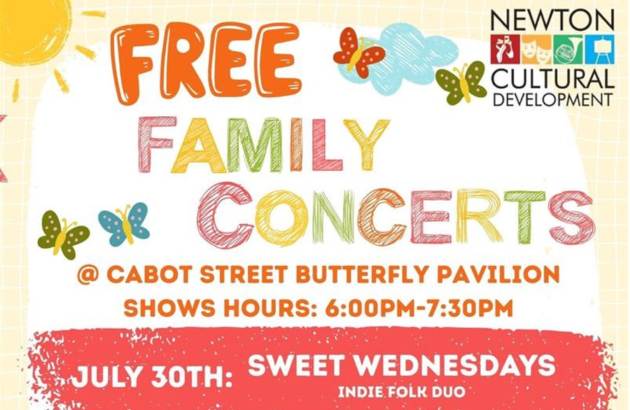 Newton Cultural Development will present a free family concert by Sweet Wednesdays on Wednesday, July 30, 6PM-7:30PM at the Cabot Street Butterfly Pavilion (101 East Side Parkway). Grab a blanket, pack a picnic, and enjoy an evening of entertainment.