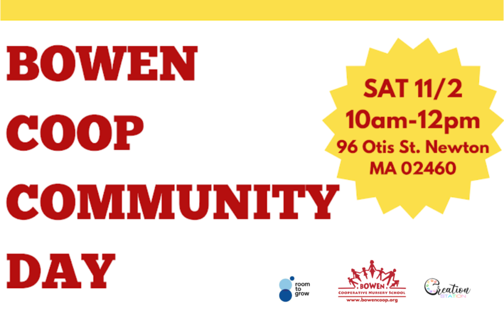 Bowen Cooperative Nursery School is hosting a Community Day with an open house, a play, snacks, crafts and more on Saturday, November 2, 10AM-12PM at the Bowen Cooperative Nursery School (96 Otis St, Newtonville). Have food, play time, a Creation Station craft activity and a book drive and service project benefiting Room to…