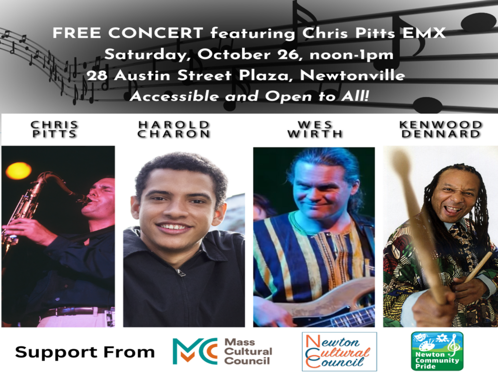 Chris Pitts EMX will be performing a free concert presented by Newton Community Pride featuring saxophonist Chris Pitts, keyboardist Harold Charon, bassist Wes Wirth, and Kenwood Denard. The concert will take place on Saturday, October 26, 12-1PM at the plaza at 28 Austin St, Newtonville and it will be free…