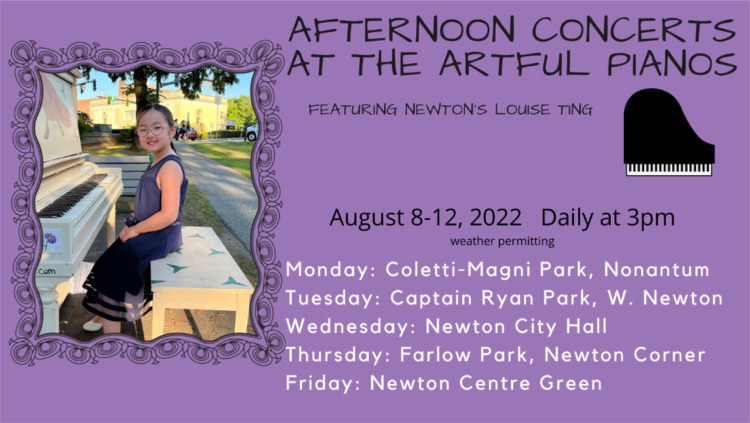 At 3PM each day, August 8-12, Louise Ting, a rising 2nd grader in Newton, will play a short concert of music by Mozart and Tchaikovsky at one of the Artful Pianos installed in various parks in Newton. Louise has just returned from a competition in Europe, and you can hear…