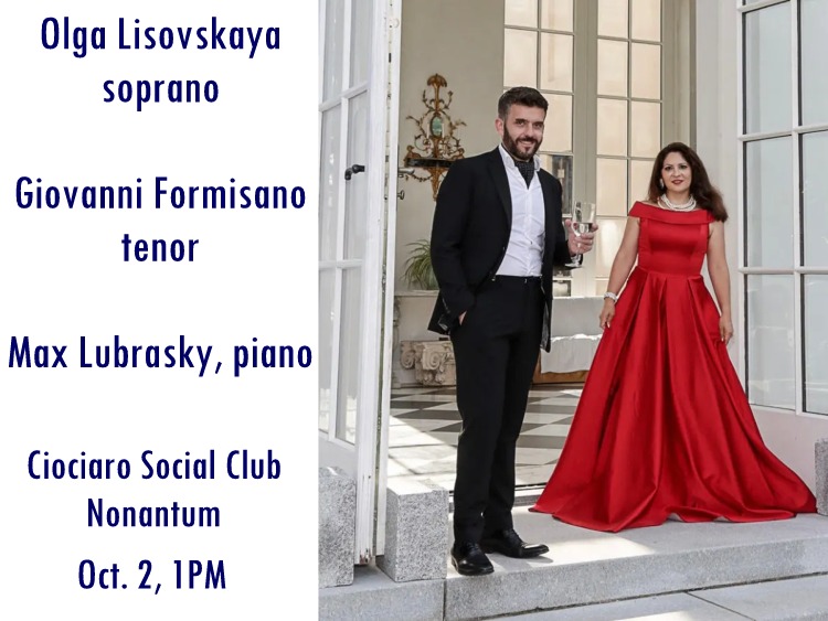 Newton Community Pride’s Fall Concert Series will feature a free concert of Italian songs and opera classics sung by soprano Olga Lisovskaya and tenor Giovanni Formisano, accompanied by Max Lubrasky on piano. It will be held at the Ciociaro Social Club (144 Bridge Street, Nonantum) on October 2 at 1PM.