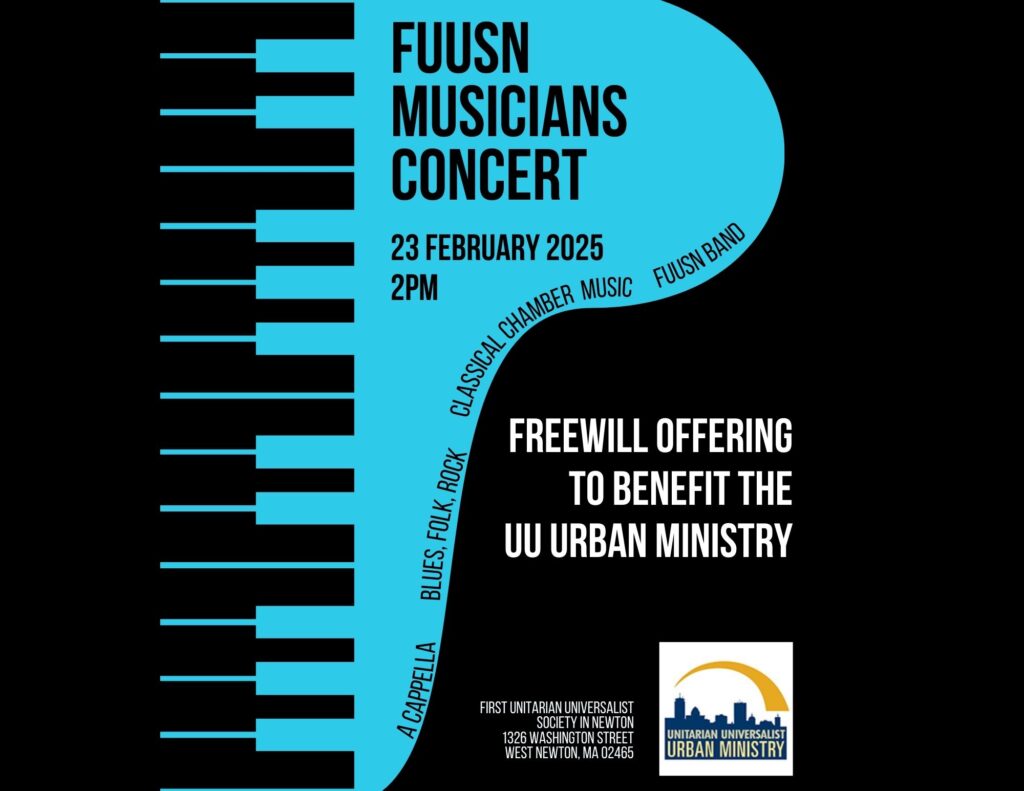 Come and hear the wonderful musicians of the First Unitarian Universalist Society in concert on Sunday, February 23, 2025 at 2PM in the FUUSN Sanctuary (1326 Washington Street, West Newton). This concert is a fundraiser for the UU Urban Ministry and includes classical chamber music by pianist Paul Antonucci, cellist Debra Minard, and…
