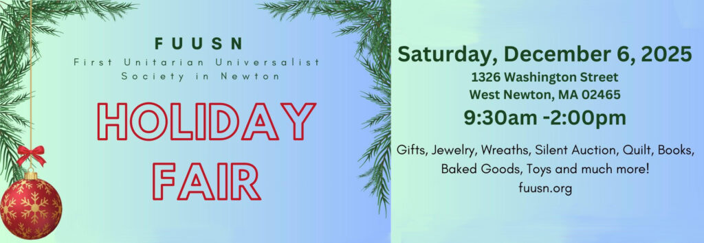 HOLIDAY SHOPPING WITH HEART. FUUSN’s Holiday Fair will be held on Saturday, December 6 from 9:30AM- 2:00PM at the Unitarian Church (1326 Washington Street, West Newton). Items for sale include: decorated wreaths, jewelry, toys, homemade baked goods, books, and holiday decorations. Enter the quilt raffle and bid in the silent…