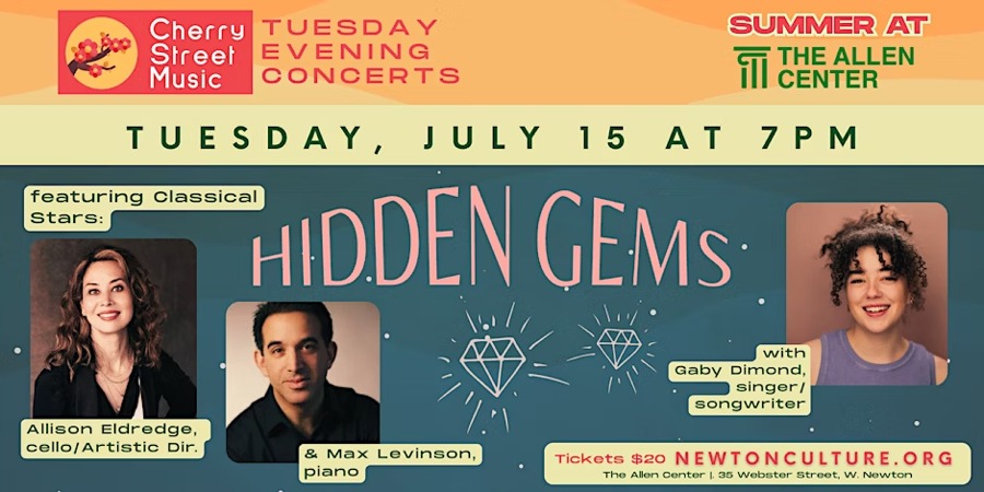 Cherry Street Music is heating things up this summer with fun, affordable concerts every Tuesday night, beginning Tuesday, July 15 at 7PM with “Hidden Gems” at The Allen Center (35 Webster Street, West Newton). Discover the music of lesser-known female composers in a unique concert experience, which will take place in The Allen Center’s intimate performance…